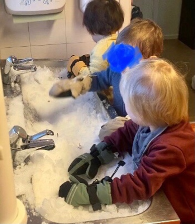 Hva er det som ligger i vasken i dag da, skal vi vaske fingrene allerede, skal vi vaske dem i snø?